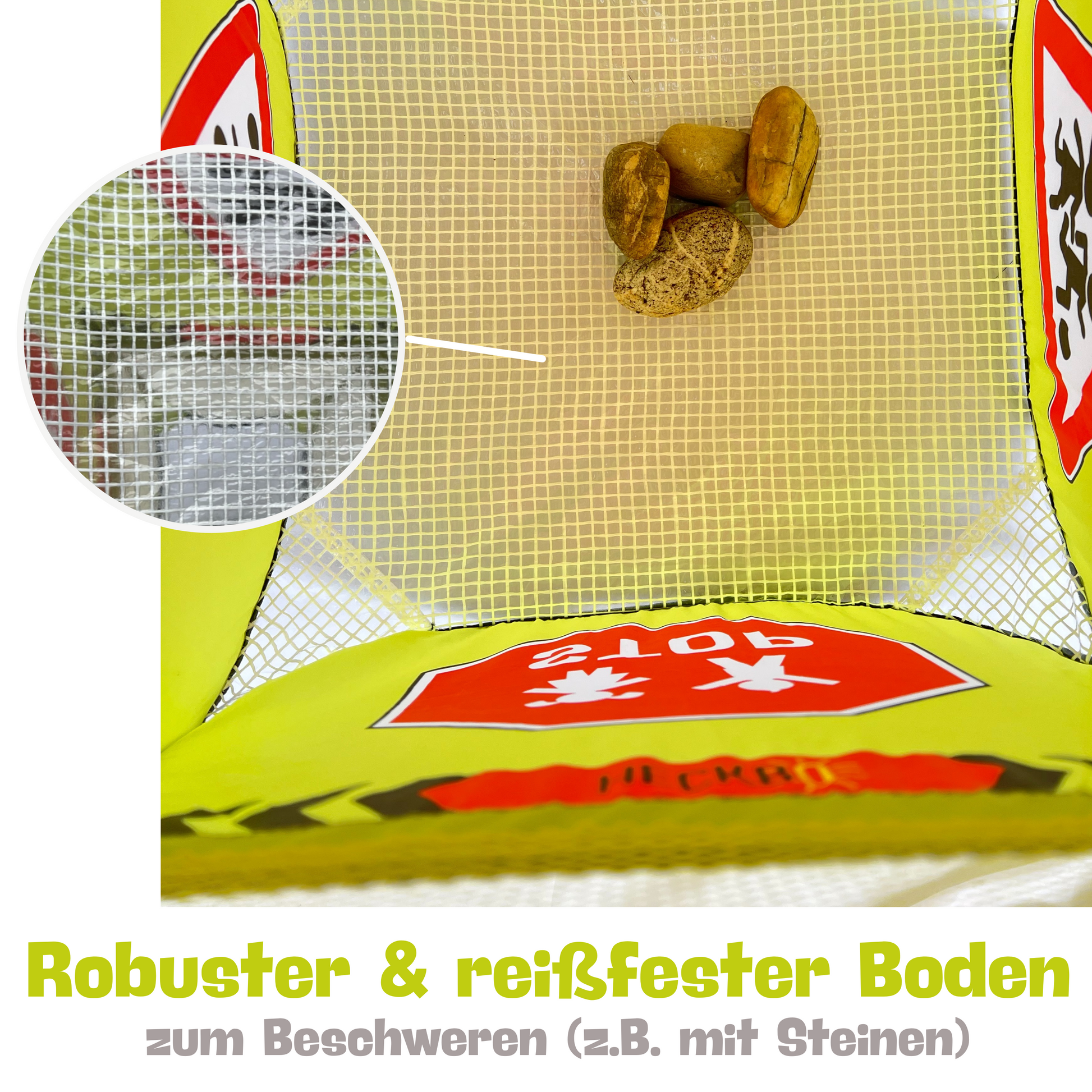 Unsere Warnwürfel sind nicht nur auffällig, sondern auch robust und wetterbeständig. Das reißfeste Polyestermaterial sorgt für langanhaltende Haltbarkeit, während der verstärkte Unterboden zusätzliche Stabilität gewährleistet. Dank der großzügigen Öffnung oben können Sie die Warnwürfel einfach mit Steinen oder anderen schweren Gegenständen beschweren, um ein Wegwehen zu verhindern.
