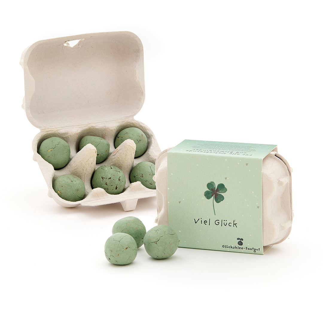 Glück verschenken leicht gemacht: Die 6 grünen Blumenmurmeln im Mini-Eierkarton enthalten Glücksklee-Saatgut – eine originelle Geschenkidee für alle, denen man Glück wünschen möchte.
