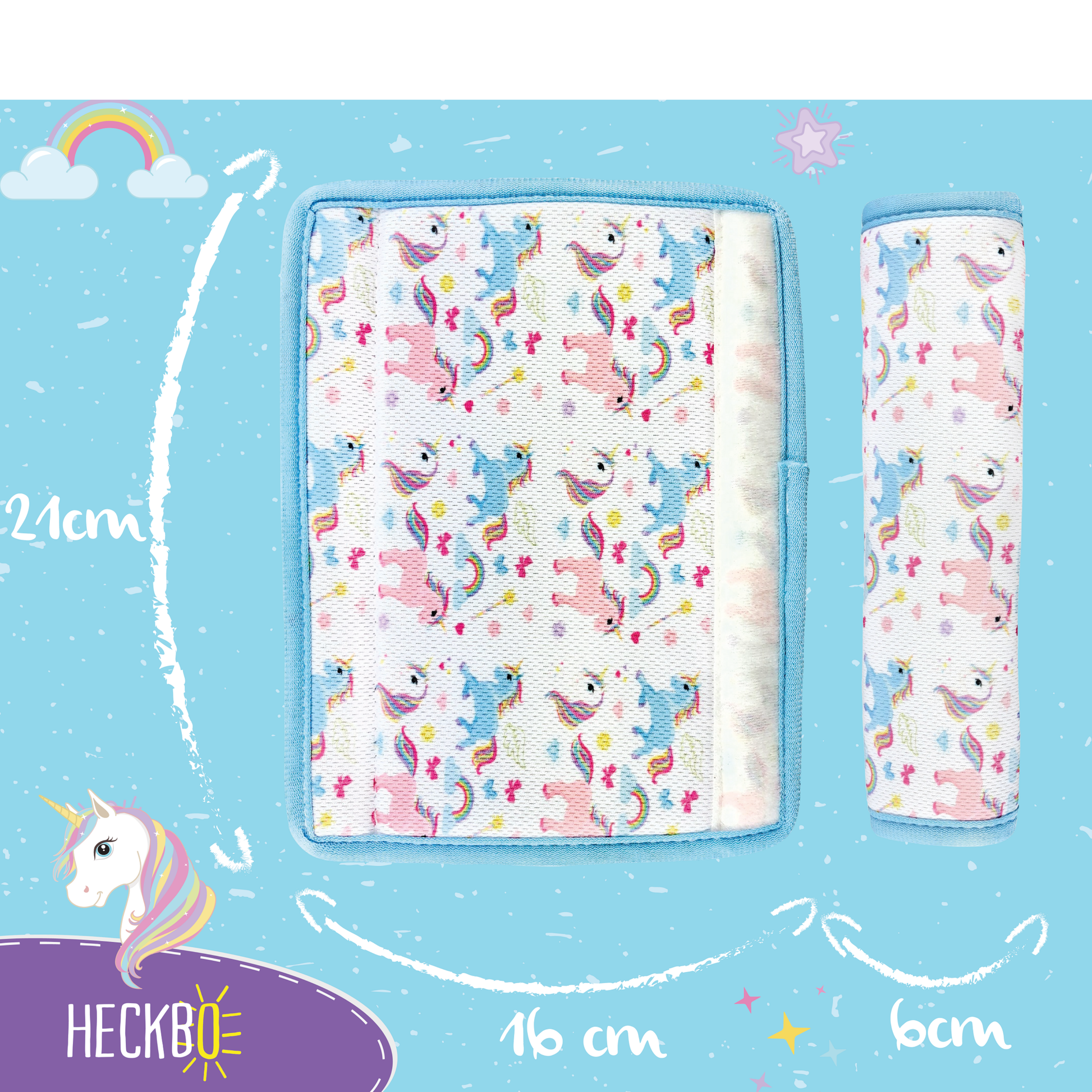 📦 LIEFERUMFANG & MAßE: 1x oder 2x HECKBO Gurtschoner mit Einhorn-Motiv. Farben: Weiß, Gelb, Pink, Türkis. Größe: 16 × 21 cm (aufgefaltet), 6 × 21 cm (zusammengefaltet). Material: 100 % Polyester (Außen), 100 % Polyethylen (Füllung).