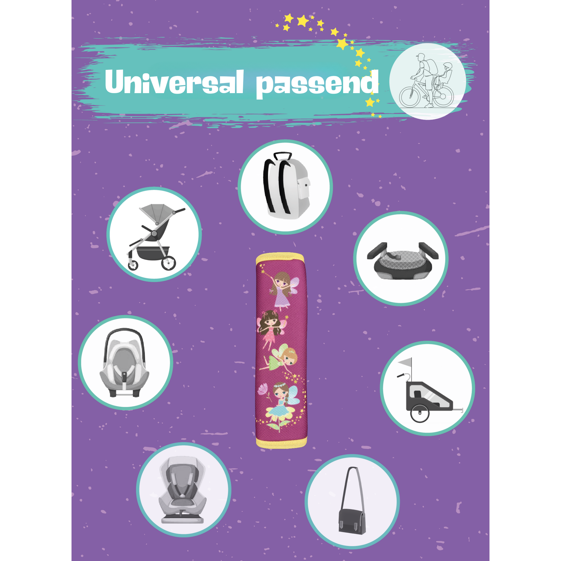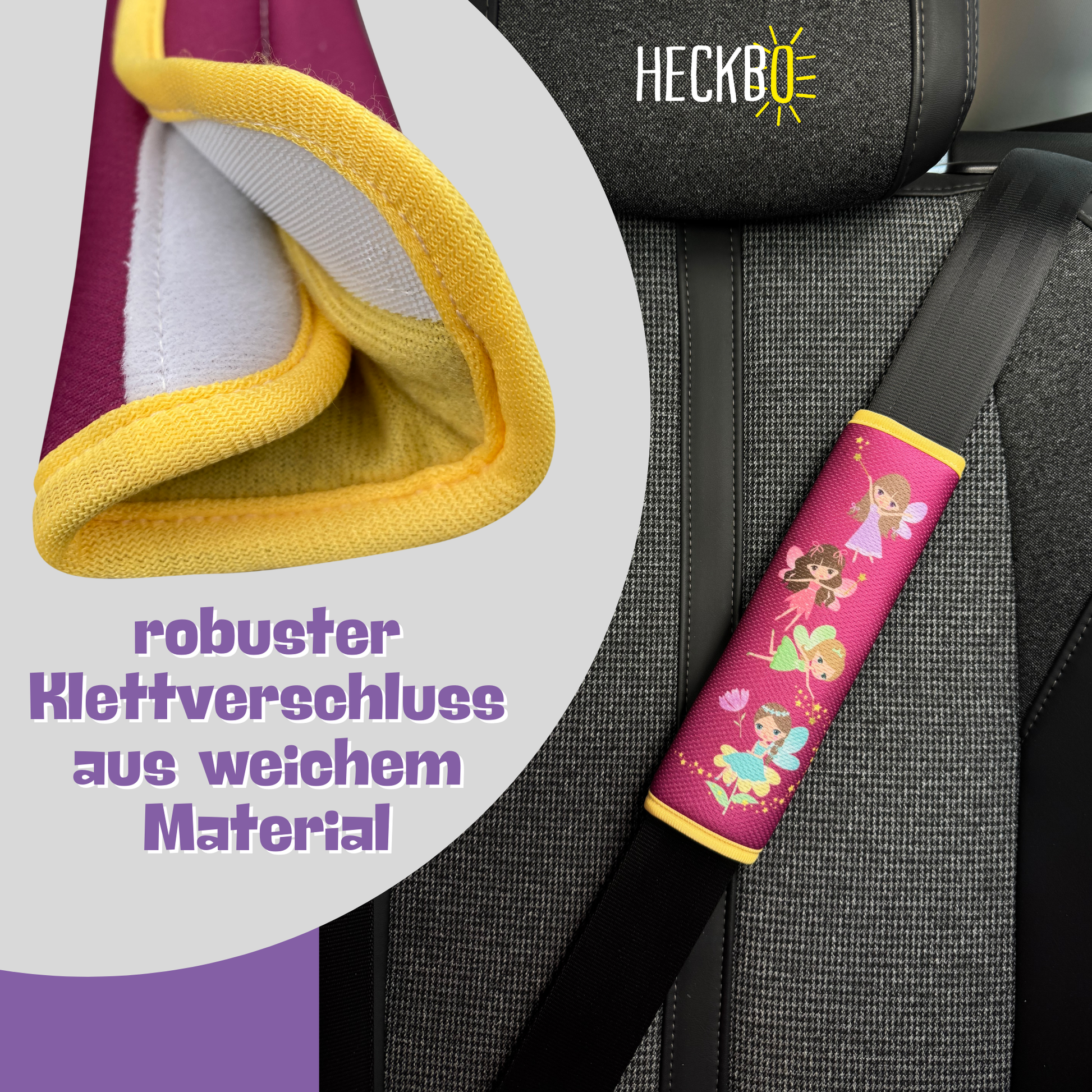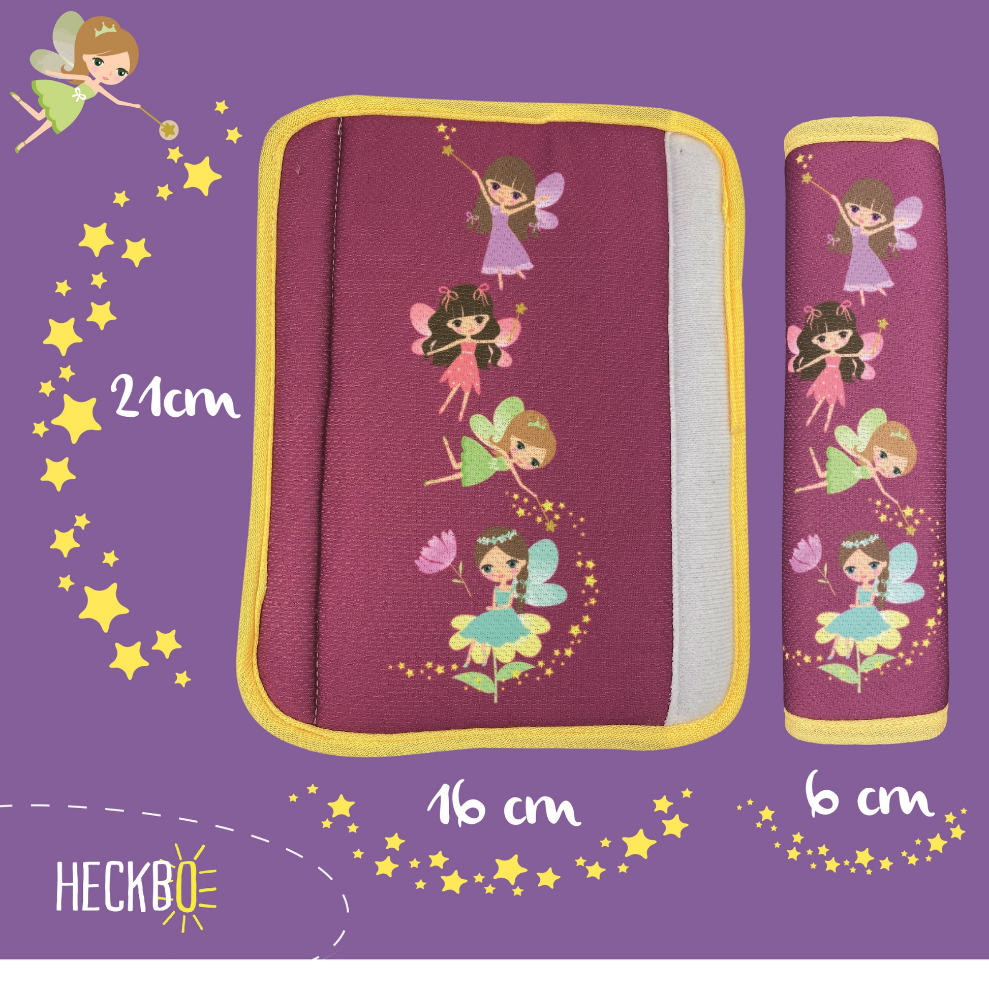 📦 LIEFERUMFANG & MAßE: 1x oder 2x HECKBO Gurtschoner mit Feen-Motiv. Farben: Gelb, Lila, Weiß, Braun, Grün, Orange, Schwarz. Hintergrund: Lila. Umrandung: Gelb. Maße: 16 × 21 cm (aufgefaltet), 6 × 21 cm (zusammengefaltet). Material: 100 % Polyester (Außenmaterial), 100 % Polyethylen (Füllung).