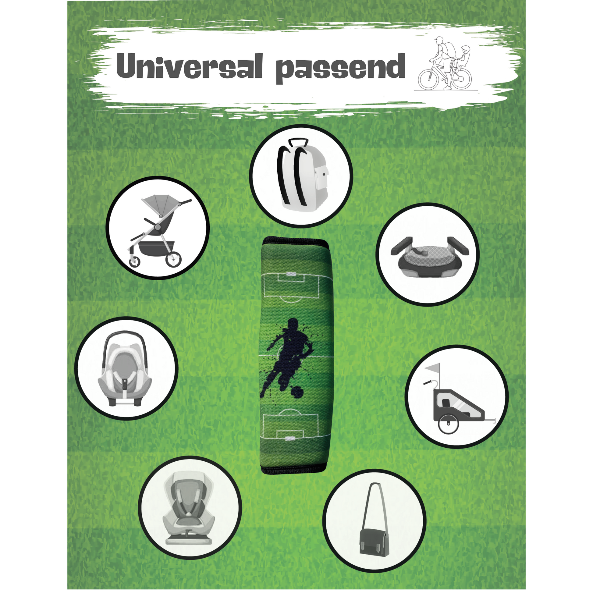 Sie erhalten 1 oder 2 HECKBO Gurtkissen mit einem dynamischen Fußball-Design: Ein Fußballer auf dem Spielfeld in leuchtendem Grün – perfekt für kleine Fußballfans! Passend dazu ist auch ein Freizeit-Turnbeutel mit dem gleichen Motiv erhältlich.