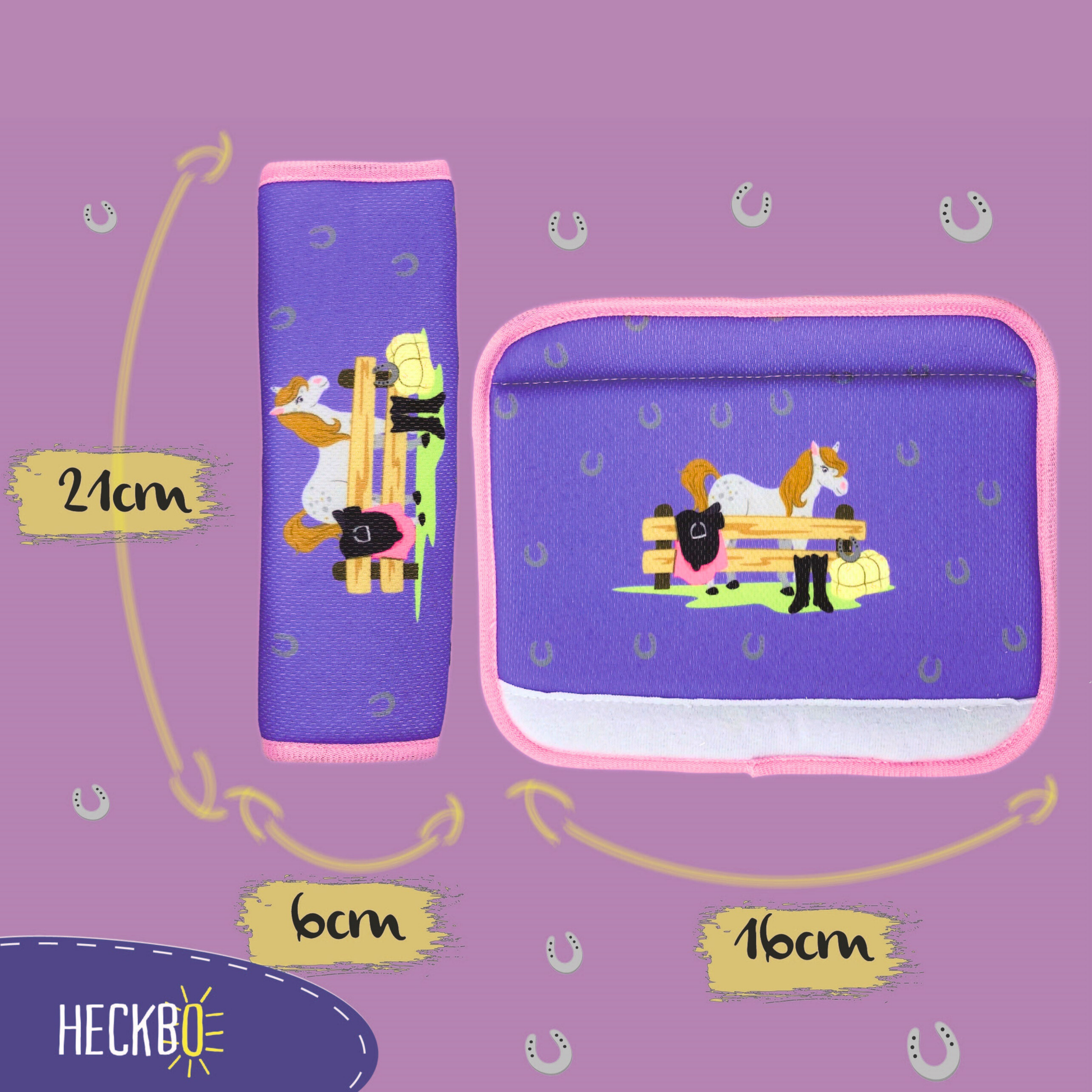 Sie erhalten 1 oder 2 HECKBO Gurtkissen mit einem liebevoll gestalteten Bauernhof-Design – bedruckt mit Pferd, Reitstiefeln, Hufeisen und Sattel in kräftigen Farben. Ein echtes Must-have für kleine Pferde-Fans! Passend dazu erhältlich: ein Freizeit-Turnbeutel und eine selbsthaftende Auto-Sonnenblende im gleichen Design.
