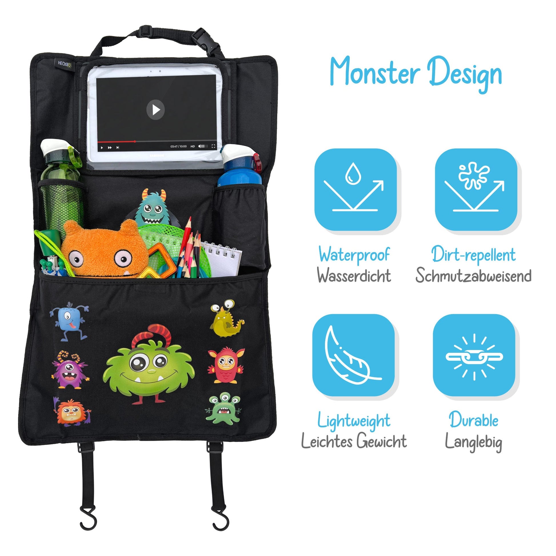 Das bunte Monstermotiv macht den Organizer zu einem echten Blickfang und begeistert Kinder sofort. Das schmutzabweisende Material schützt die Rücklehne und lässt sich ganz einfach mit einem feuchten Tuch reinigen.