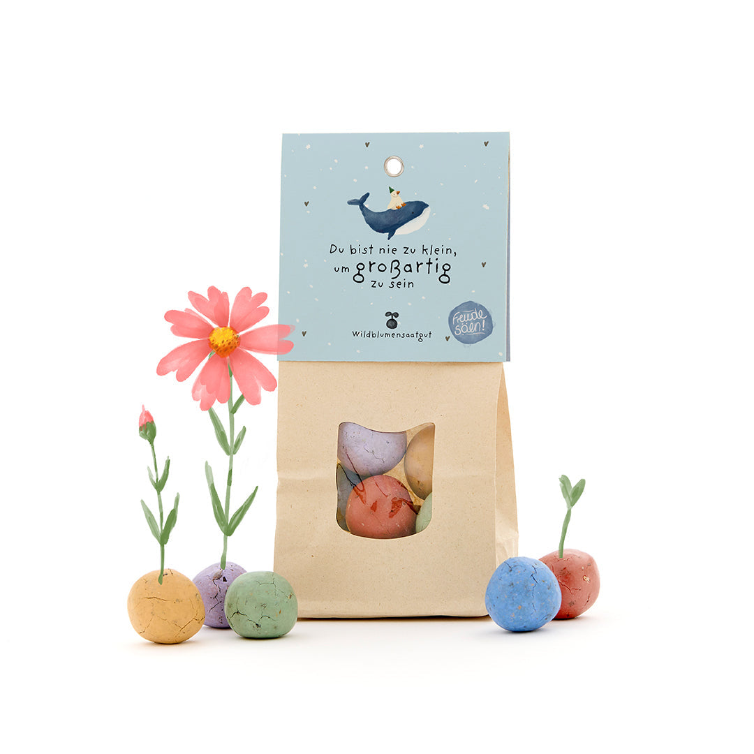 Verschenke einen blühenden Mutmacher: In dieser hübsch gestalteten Papiertüte stecken 8 Wildblumen-Saatkugeln – voller Farbe, Hoffnung und Symbolkraft. Die aufgedruckte Botschaft schenkt kleinen und großen Heldinnen und Helden einen liebevollen Schubs in Richtung Selbstvertrauen und Zuversicht.