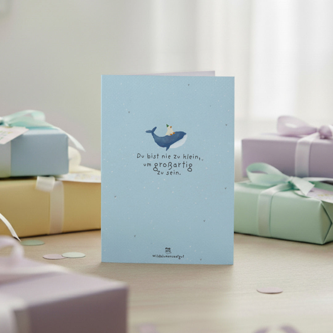 Du bist nie zu klein, um großartig zu sein: Diese Karte ist eine liebevolle Erinnerung daran, dass auch kleine Schritte Großes bewirken können. Perfekt als Mutmacher zur Einschulung, zum Schulanfang, Geburtstag oder einfach für jemanden, der gerade ein bisschen Ermutigung gebrauchen kann - egal wie alt.