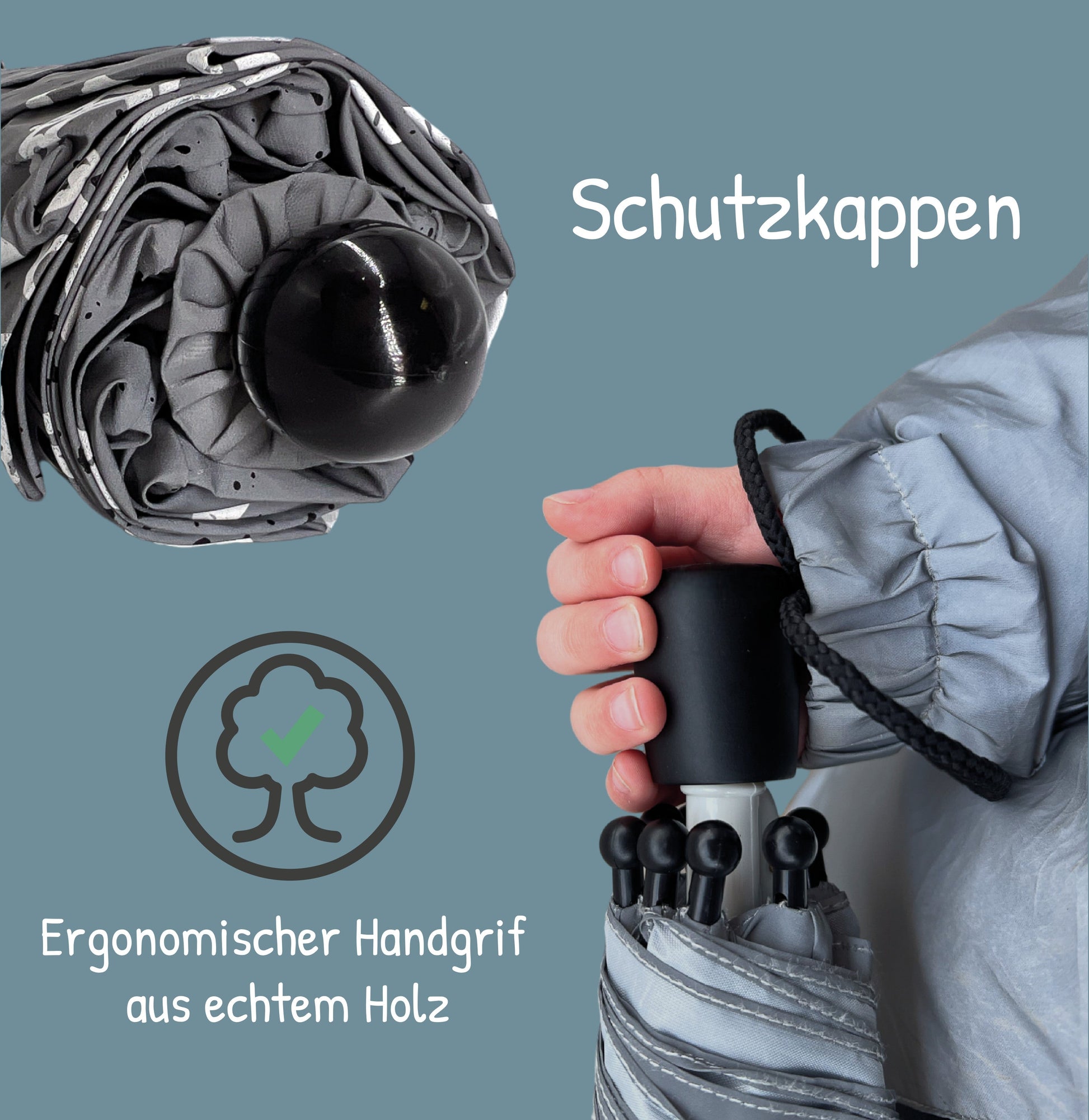 Das Schirmmaterial verfügt über reflektierende Eigenschaften und sorgt so für bessere Sichtbarkeit bei Dunkelheit. Zusätzlich sind die Schirmspitzen mit abgerundeten Kunststoffkugeln versehen, um das Verletzungsrisiko zu minimieren.
