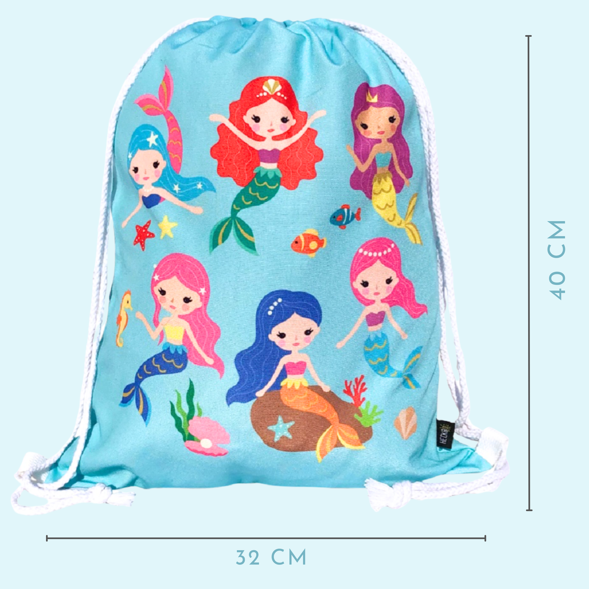 Dieser hellblaue HECKBO Turnbeutel begeistert mit einem liebevoll gestalteten Meerjungfrauen-Motiv. Muscheln, Seesterne, Fische und bunte Meerjungfrauen zieren beide Seiten – ein echter Hingucker für kleine Meeresfans!